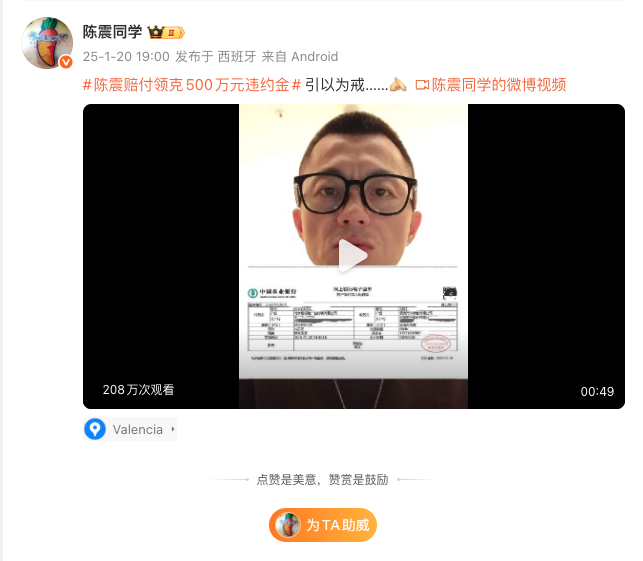 此后,陈震晒出银行转账记录,并拍摄视频称500万元赔偿金已支付。
