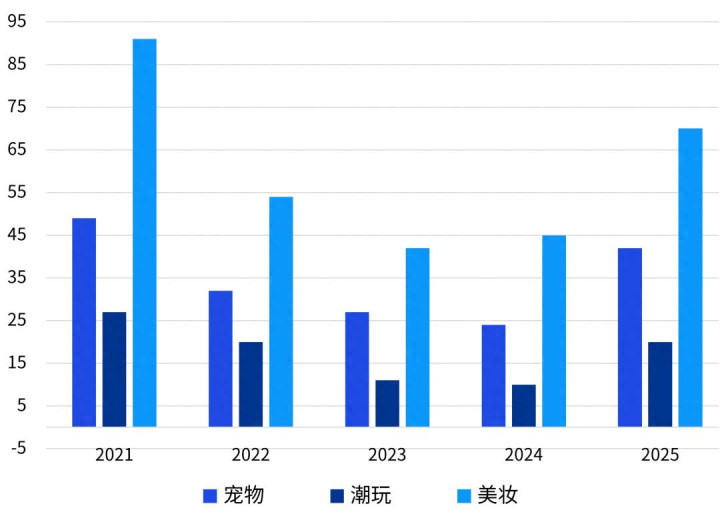 从投融资笔数来看,过去五年三大情绪消费赛道呈现U型走势。2021年是情绪消费的巅峰之年。三大赛道共获得167笔融资,其中美妆赛道91笔融资,宠物赛道49笔次之,潮玩赛道27笔。这一年,疫情催生的宅经济、孤独经济与颜值经济叠加,情绪价值成为资本追逐的风口。2022-2024年进入调整期,整体融资笔数逐年下滑,2024年较2021年已近腰斩。但是2025年迎来强劲复苏,三大赛道总融资笔数同比增幅达67%。其中潮玩赛道反弹最为迅猛,翻倍增长,宠物赛道也实现将近75%的增幅,美妆赛道增长56%。这表明经过三年洗牌,优质企业脱颖而出。