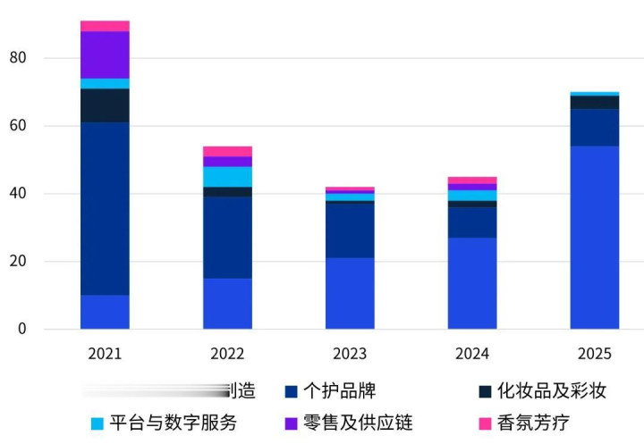 与此同时,下游品牌与渠道端加速分化,个护品牌融资从2021年的51笔逐步回归理性,2025年小幅回升至11笔,资本正向具备真实技术支撑与长期价值的品牌集中;零售及供应链、平台与数字服务、香氛芳疗等传统流量型赛道融资持续收缩,美妆产业投资重心稳步向高技术附加值领域转移。