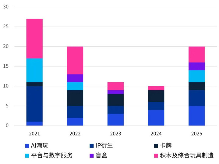 集换式卡牌在经历2022年泡沫后,2025年融资回归理性,资本关注的是“互动陪伴”与“收藏体系”的可持续性。AI潮玩虽融资笔数不多(2025年为5笔),但已从概念走向产品落地,如可感知情绪的智能玩偶、可编程积木,正成为新一代“情感陪伴”载体。