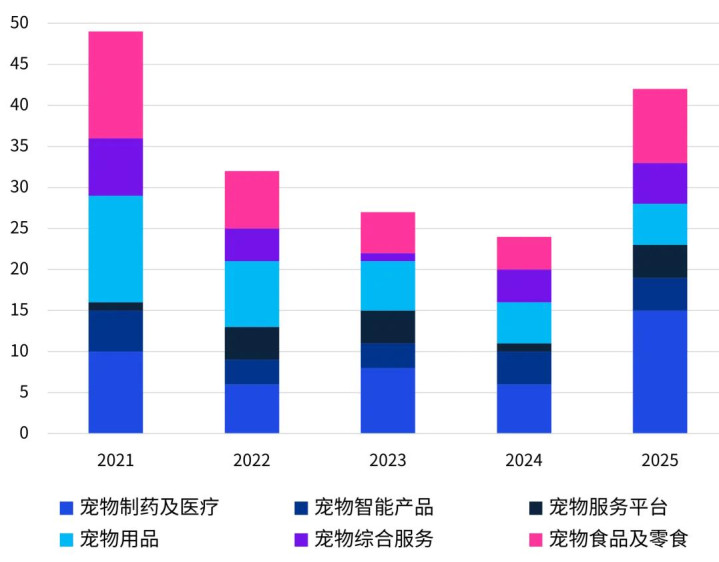宠物经济是情绪消费中最具韧性的赛道。尽管2021-2024年融资笔数从49笔降至24笔,但2025年强势反弹至42笔,显示出“它经济”的持久生命力。
