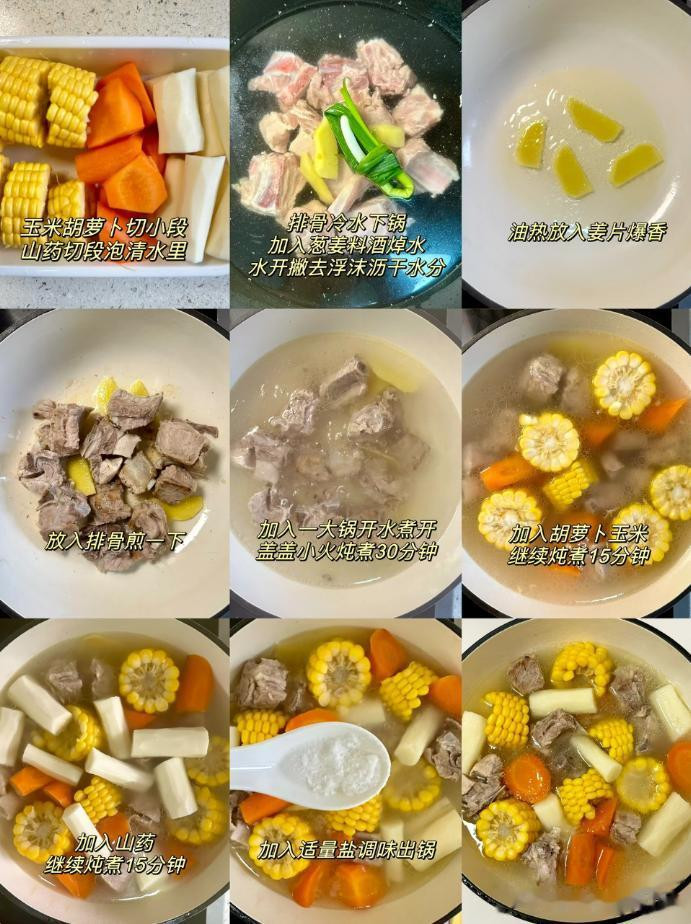 山药排骨汤:排骨焯水后加姜片炖1小时,放入山药块再炖20分钟,撒枸杞出锅。汤白味鲜,喝完脾胃舒心。