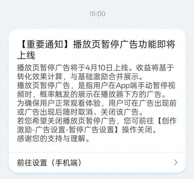 4月8日,视频网站Bilibili(以下简称“B站”)通过创作激励规画官方账号“超绝可儿激大励”向站内创作家推送见告,晓示将于2026年4月10日起上线播放页暂停告白功能。