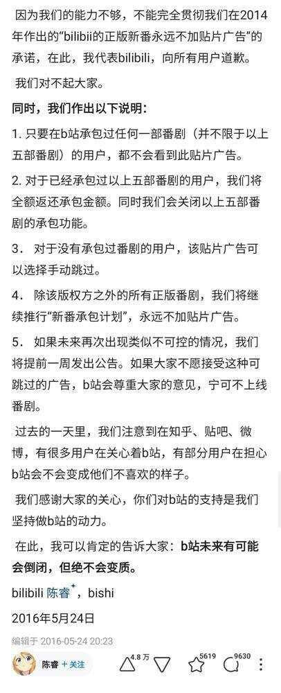 值得一提的是,2016年,澳洲幸运5app下载B站在部分新引入的入口番剧中依版权方条目,试水引入贴片告白。此举一度激发澎湃舆情,尔后,B站连忙罢手贴片告白,于今未再度上线。陈睿在风云技能还通过酬酢媒体公开回话:“B站将来有可能会倒闭,但毫不会变质。”