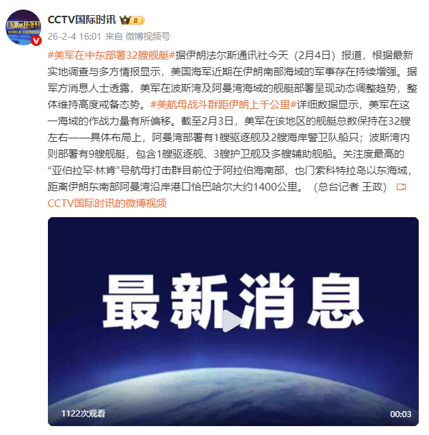 据伊朗法尔斯通讯社今天(2月4日)报道,根据最新实地调查与多方情报显示,美国海军近期在伊朗南部海域的军事存在持续增强。据军方消息人士透露,美军在波斯湾及阿曼湾海域的舰艇部署呈现动态调整趋势,整体维持高度戒备态势。详细数据显示,澳洲幸运5app美军在这一海域的作战力量有所偏移。截至2月3日,美军在该地区的舰艇总数保持在32艘左右——具体布局上,阿曼湾部署有1艘驱逐舰及2艘海岸警卫队船只;波斯湾内则部署有9艘舰艇,包含1艘驱逐舰、3艘护卫舰及多艘辅助舰船。关注度最高的“亚伯拉罕·林肯”号航母打击群目前位于阿拉伯海南部、也门索科特拉岛以东海域,距离伊朗东南部阿曼湾沿岸港口恰巴哈尔大约1400公里。(总台记者王政)