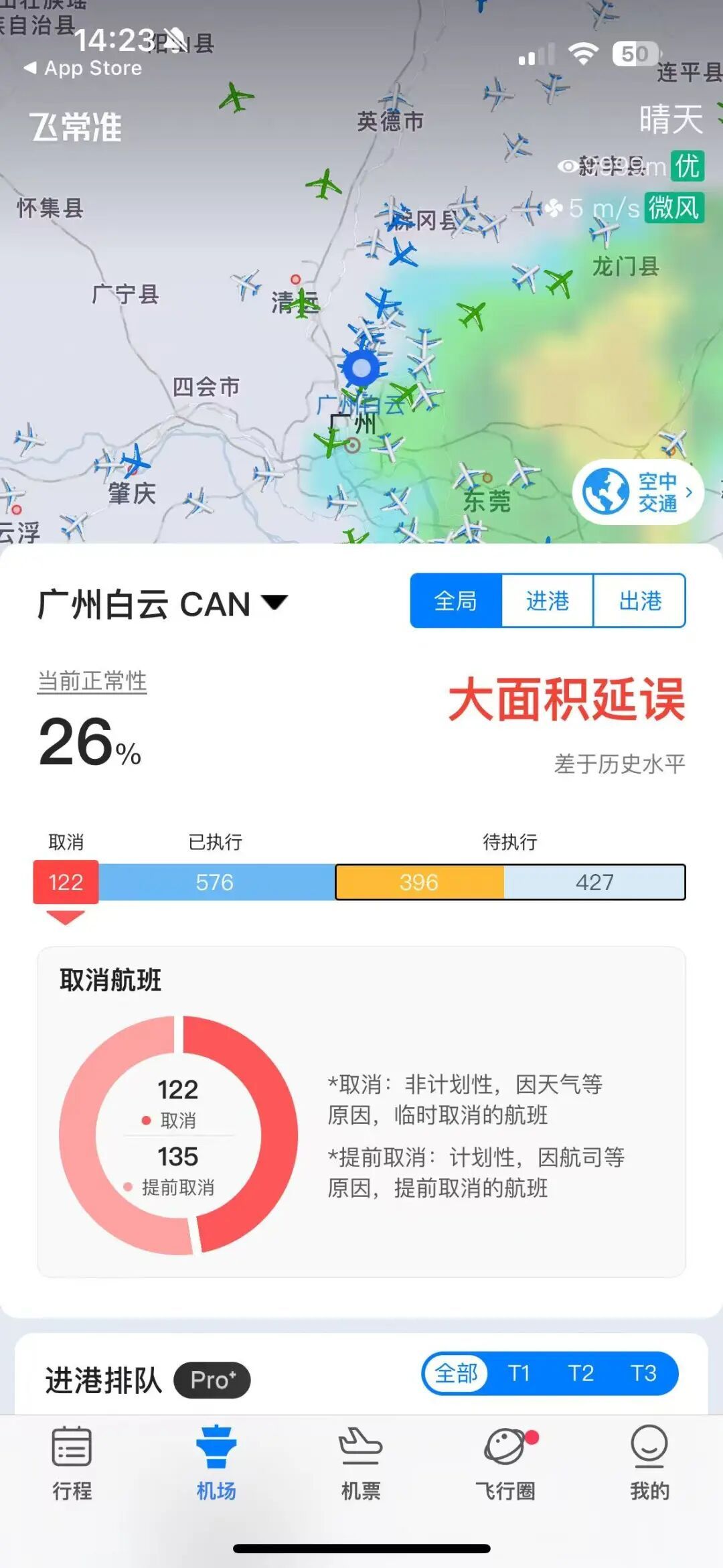 飞常准数据败露,今天,广州白云机场大面积延误。