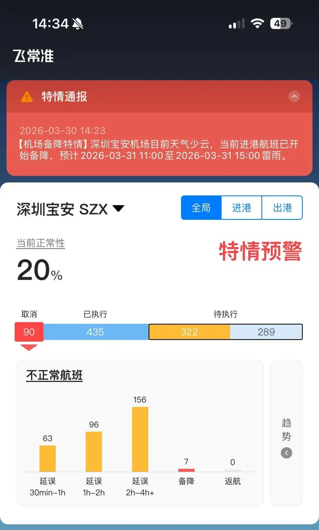 飞常准数据败露,14时23分,深圳宝安机场发布特情通报:深圳宝安机场现在天气多云,现时进港航班已运转备降,瞻望2026年3月31日11时至2026年3月31日15时雷雨。