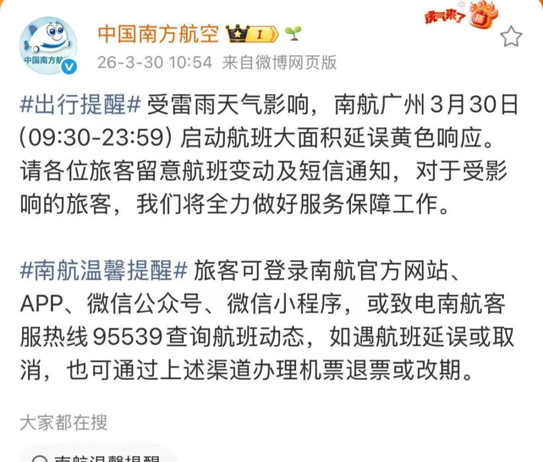 受雷雨天气影响,南航广州3月30日(09:30-23:59)启动航班大面积延误黄色反应。