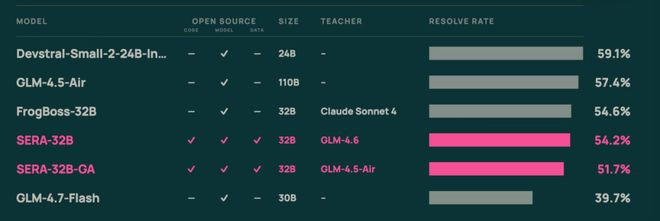 在轨范编码基准测试SWE-Bench中,SERA-32B交出了一份令东说念主惊艳的收获单:在64K落魄文长度下,处理率达到54.2%,杰出了通盘同边界开源模子。