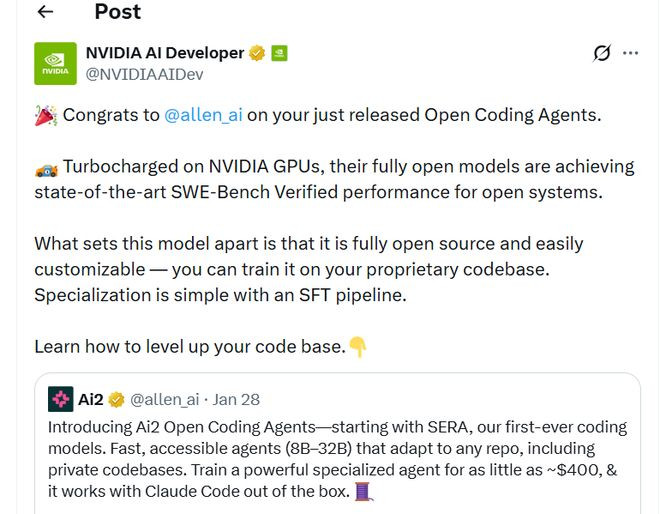 SERA展示出的小模子+高质料数据的技能旅途,减少了对顶点算力资源的依赖,使得在更接近数据源的地方进行试验和推理成为可能。这将改动AI智能体的发展场所。