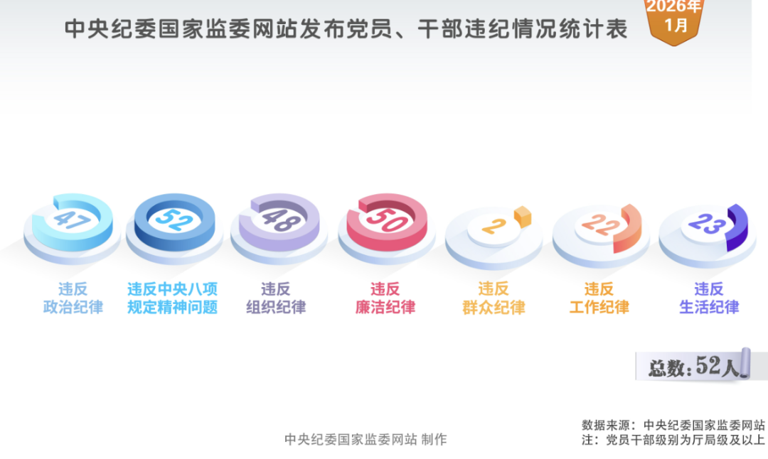 中央纪委国家监委网站发布的52条党纪政务处分信息中,47人违反政治纪律,52人违反中央八项规定精神,48人违反组织纪律,50人违反廉洁纪律,2人违反群众纪律,22人违反工作纪律,23人违反生活纪律。
