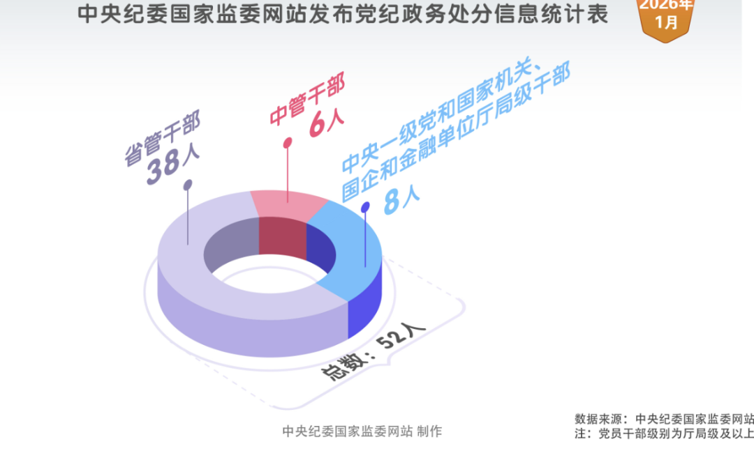 中央纪委国家监委网站共发布52条党纪政务处分信息。其中,中管干部6人,中央一级党和国家机关、国企和金融单位厅局级干部8人,省管干部38人。