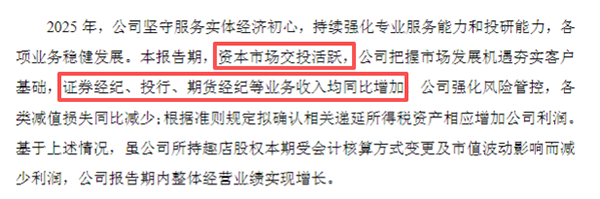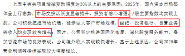 多家券商在业绩预告或快报中指出,2025年资本市场活跃度提升,投资者信心增强,公司证券经纪、投资银行及自营业务等板块收入较上年均有显著提升,推动了整体业绩实现增长。