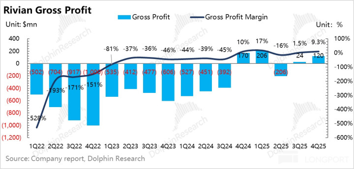 但 Rivian 之前率领 2026 年四季度能实现 R2 的毛利率转正,主要由于和公共麇集采购带来的 BOM 成本的下滑,以及销量升迁对单车摊折成本下滑所致。