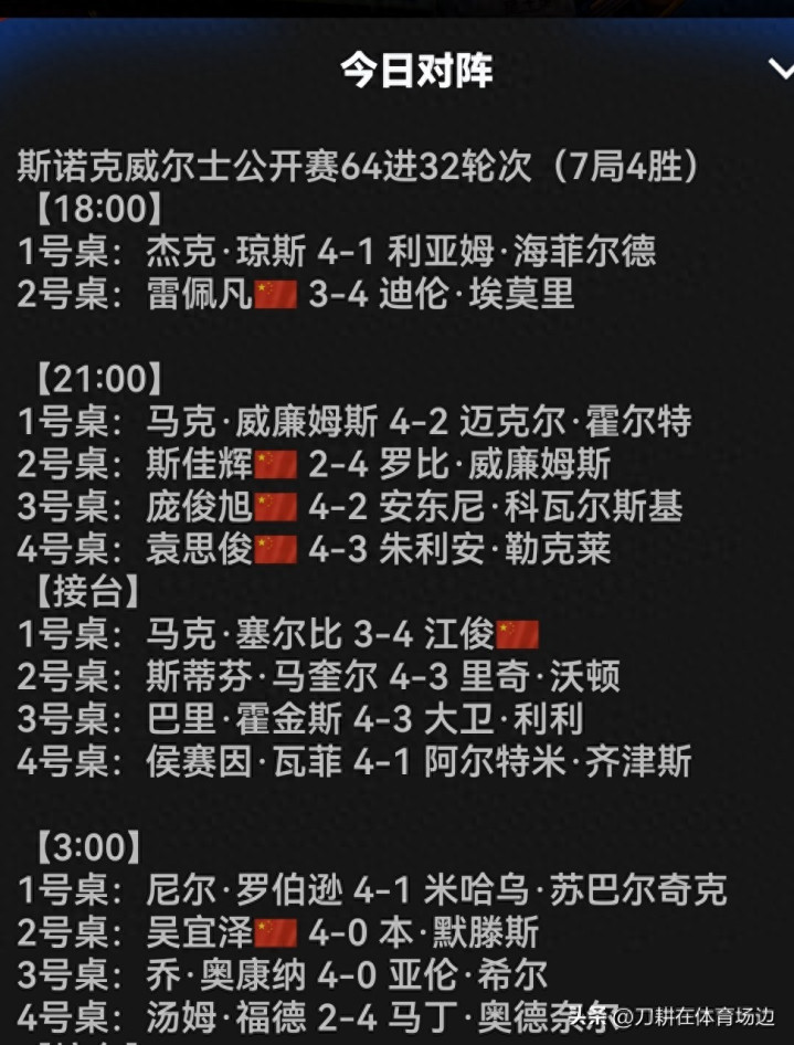 在其他比赛中,袁念念俊4:3绝杀勒克莱、庞俊旭4:2利瓦尔斯基联袂晋级。马奎尔、霍金斯、马克·威廉姆斯、尼尔·罗伯逊等名将也齐得胜晋级。