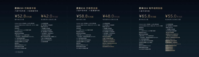 4月9日,科技行政旗舰SUV——蔚来ES9负责发布并开启预售。ES9行政豪华版预售价528,000元起,遴选BaaS电板租用面孔购买,预售价420,000元起;行政签名版预售价588,000元起,遴选BaaS电板租用面孔购买,预售价480,000元起,地平线特殊版预售价658,000元起,遴选BaaS电板租用面孔购买,预售价550,000元起。