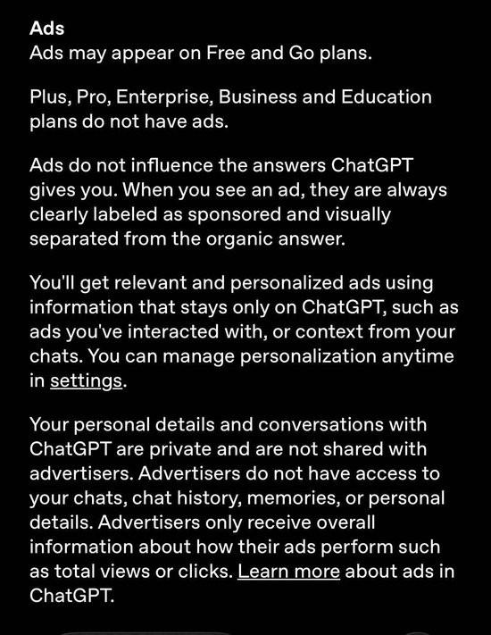 不外,OpenAI的告白打算联想得相称严慎。阐发公司发布的战略,告白将只在免用度户和每月8好意思元的Go套餐用户中测试,而Plus(每月20好意思元)、Pro(每月200好意思元)以及营业和企业订阅用户将不会看到告白。