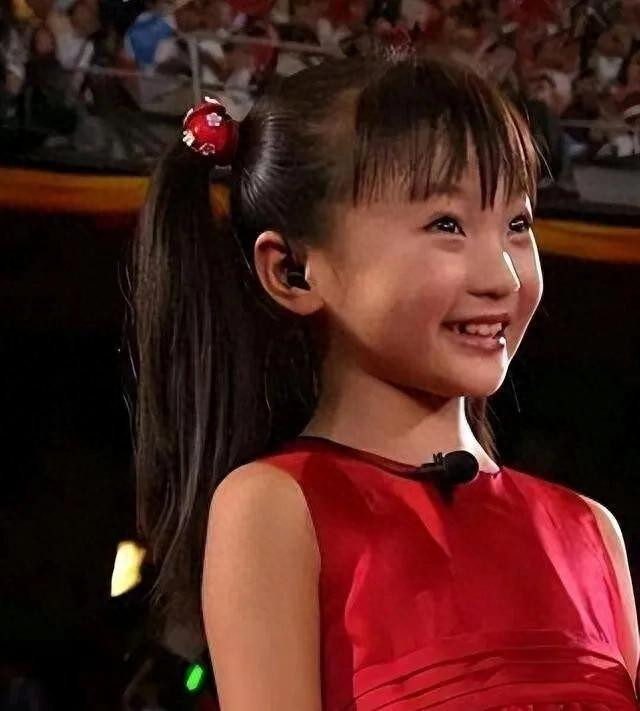 一个扎着双马尾、身穿红纱裙的9岁女孩,站在九万不雅众眼前,用稚嫩的声息唱响了《称赞故国》。