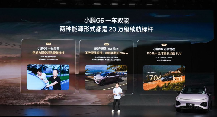 先说硬方针。小鹏G6超等增程搭载55.8kWh电板和60L油箱,CLTC概括续航1704公里,纯电续航430公里。这个数据当今是巨匠概括续航最长的SUV,莫得之一。