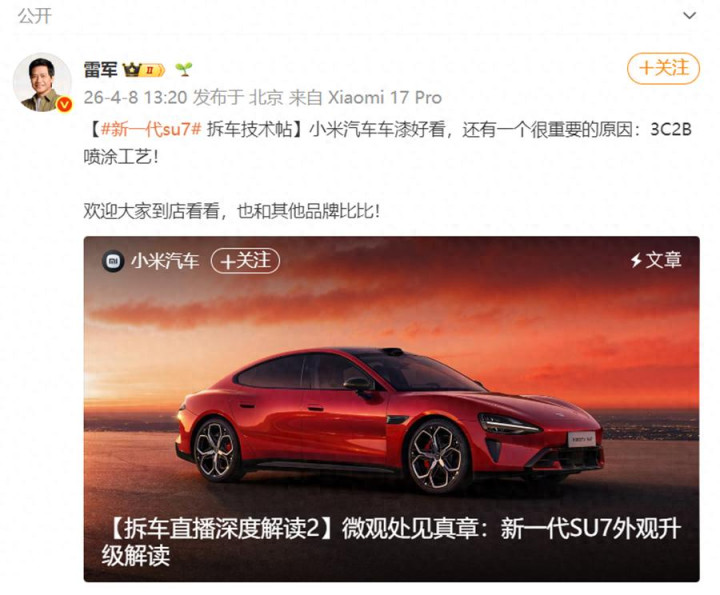 4月8日,雷军发布一条动态称:“小米汽车车漆颜面,还有一个很首要的原因:3C2B喷涂工艺!接待全球到店望望,也和其他品牌比比!”