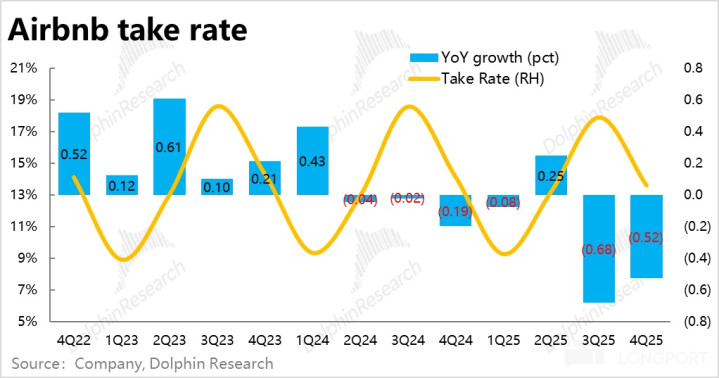 在不俗预订的带动下,本季Airbnb 的营收同比增长 12%,雷同较上季有超 2pct 的不小提速,好于预期。其中汇率顺风利好约 1pct。然则,本季的净变现率依然鄙人滑,约 52bps,且跌幅较大,因此导致营收增速比较 GBV 彰着跑输。